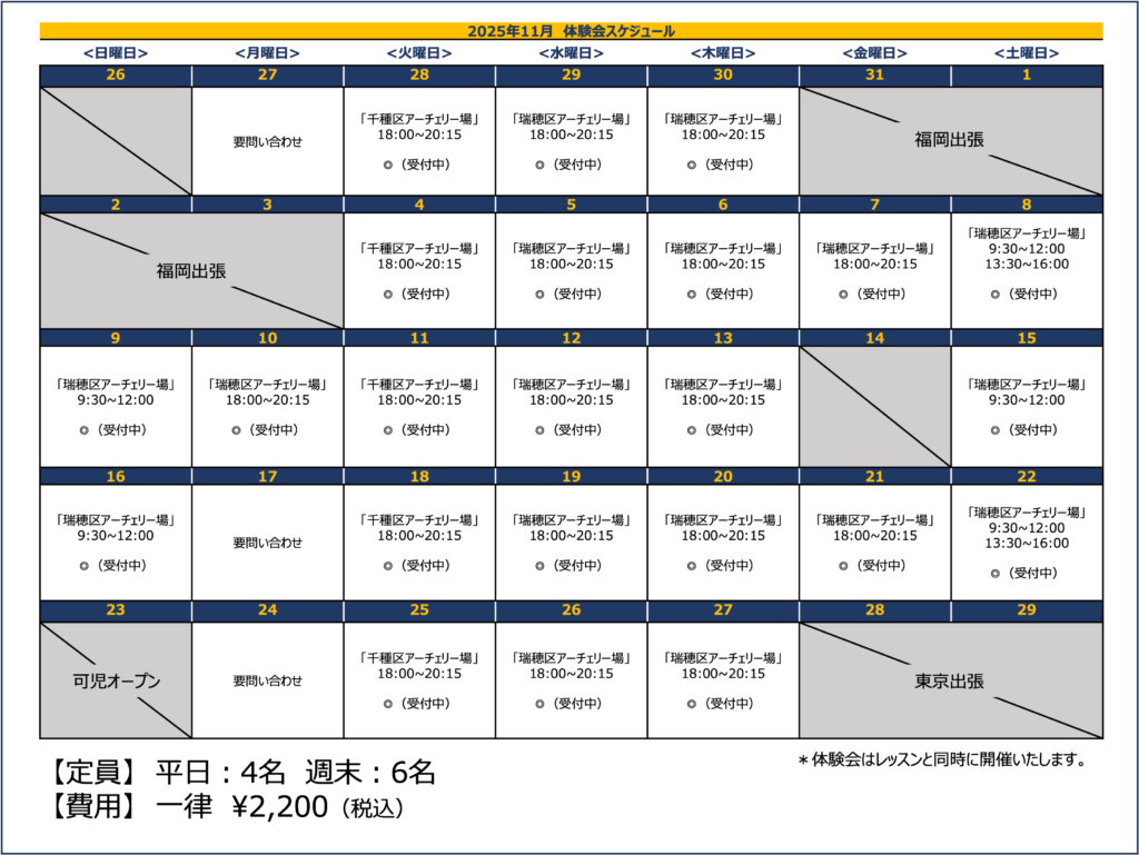 | 見学 & 体験 | クラブの雰囲気を見ながら、矢を射ちたい!という人 レッスンに来ている会員さんと交流を図りながら、 自分なりのアーチェリーの楽しさを探します。 | 一律 2200円(税込) |